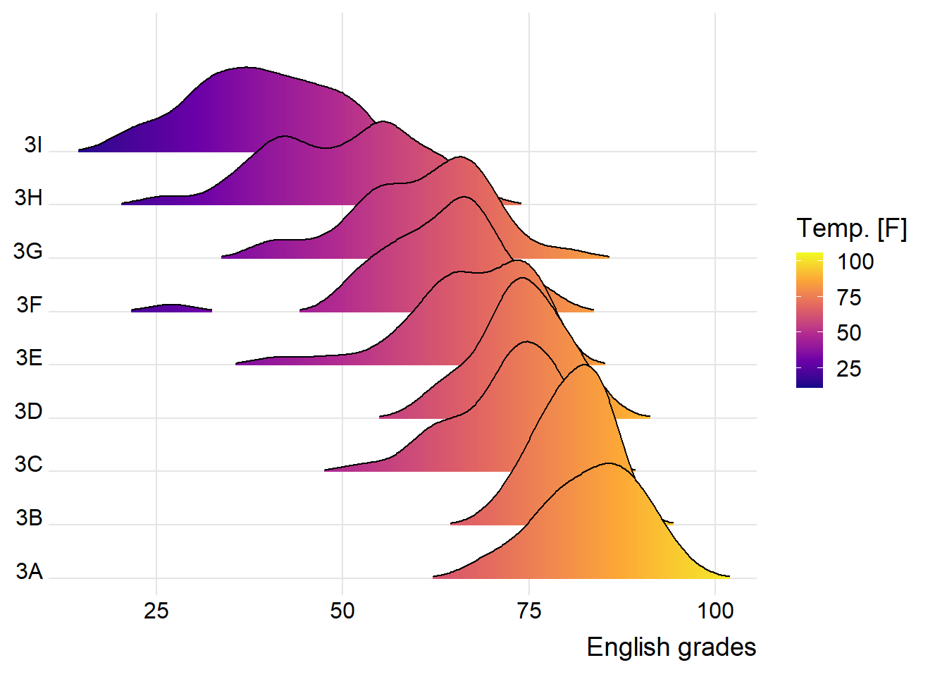 geom_density_ridges_gradient(): make the area under a ridgeline filled with colors that vary in some form along the x axis (do not allow for alpha transparency in the fill)